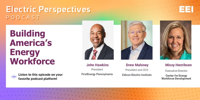 Electric Perspectives podcast featuring FirstEnergy Pennsylvania President John Hawkins and Center for Energy Workforce Development (CEWD) Executive Director Missy Henriksen. In this conversation hosted by EEI President and CEO Drew Maloney, the industry leaders discussed the electric power industry’s workforce development priorities, new apprenticeship partnerships and training programs, and how EEI’s member companies are preparing the next generation of skilled energy workers.